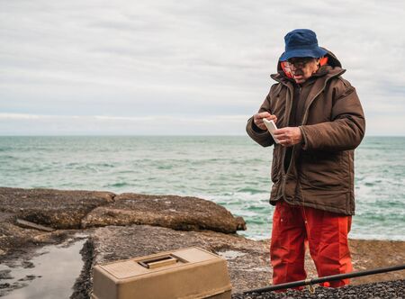 Portrait of a fisherman putting on bait with fishing equipment box. Fishing and sport concept.