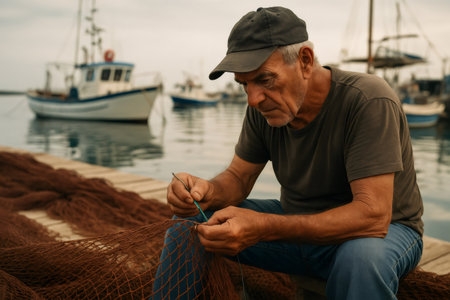 A Mature fisherman mending fishing nets on dock, showcasing weathered hands and focused expression