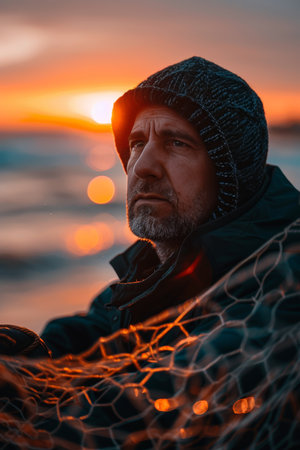 A rugged fisherman stands by the dock, looking thoughtfully towards the water. The sunset casts a warm glow on his face, reflecting years of dedication to his craft.