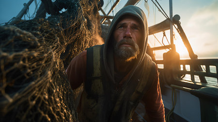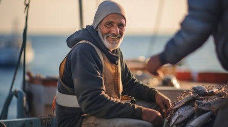 A fisherman with a fresh catch of fish in a net, on a boat at dawn. Evokes tradition, sustainable seafood, and the serene beauty of coastal life.