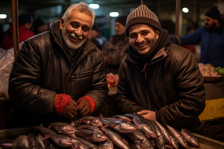 A weathered fisherman proudly showcases his impressive catch, exuding authentic emotions of triumph and fulfillment in his traditional fishing practice.