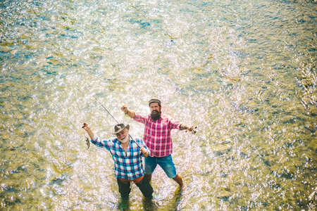 Male friendship. Men stand in water. Fishing is much more than fish. Happy fisherman with fishing rod and net. Hobby and sport activity. Father and son fishing. Summer weekend. Fishing together