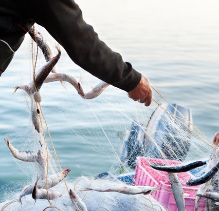 fishers take fish out of a net