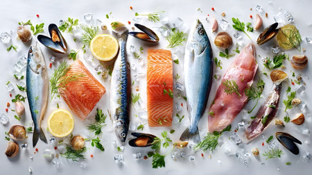 Variety of fresh raw seafood items including whole fish, salmon fillets, mussels, and clams displayed on ice with lemon slices and herbs, representing healthy eating and gourmet cuisine