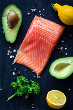 Fresh salmon, lemons, avocados, parsley and spices on black cutting board on textured wooden background. Top view
