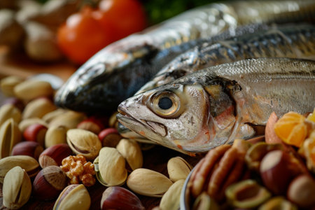 Healthy food selection: fish, nuts, fruits and vegetables.