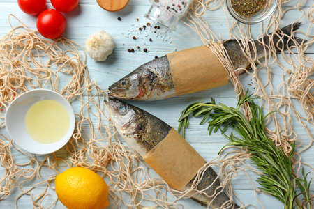 Fresh sea bass with ingredients on wooden table