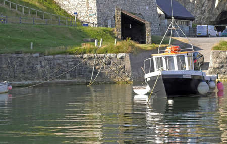 Fisherman boat harbour village in Wales, UK, england cloudy sky and green hills
