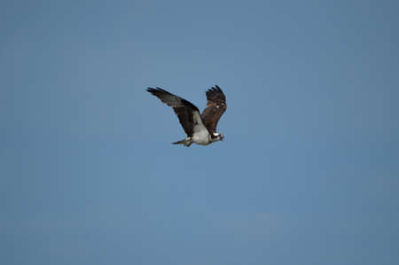 Osprey bird of prey Pandion haliaetus flying across a blue sky over Clam pass in Naples, Florida in the morning.