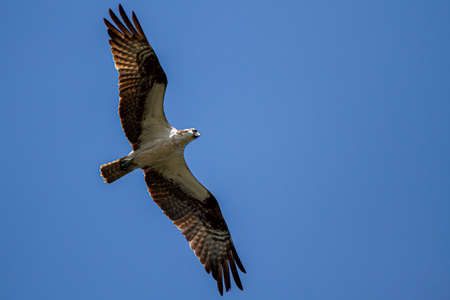Fierce Osprey bird has wings spread wide in flight while circling in search of prey to eat.
