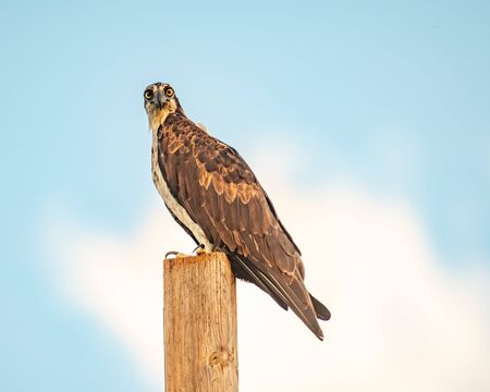 Osprey sitting on wooden pole against blue sky with clouds, Mexico