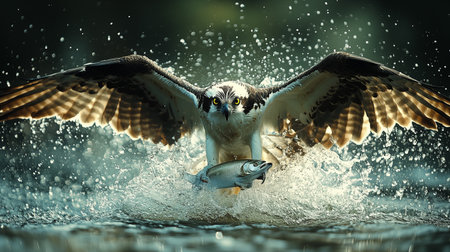 A stunning image of an osprey catching a fish from the water, showcasing its powerful wings and dynamic splash. The vibrant natural setting highlights wildlife in action.