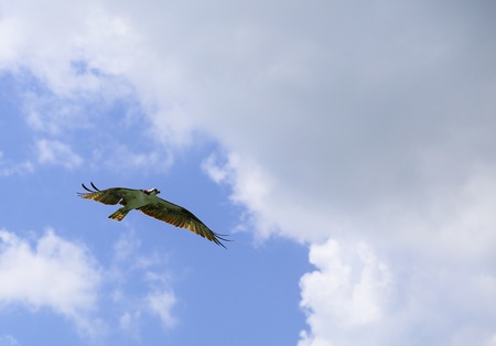 Osprey or sea hawk or Pandion haliaetus flying with its wings wide open. This bird of prey is called fish eagle. Mainly lives near wetlands and lakes.