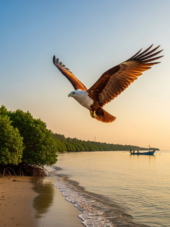 Brahminy eagle flying in the sky over the sea.