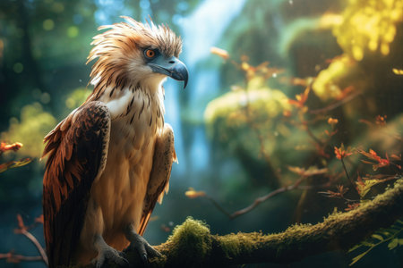 A Philippine Eagle perching on a branch in its natural rainforest habitat