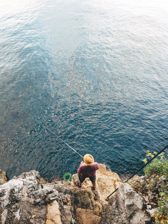 High angle view of unrecognizable male with straw hat fishing with rod at rocky seaside coastline
