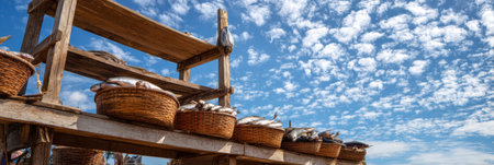 Market stall features a variety of baskets filled with fresh fish, set against a vibrant blue sky and fluffy clouds, showcasing a lively trading atmosphere.