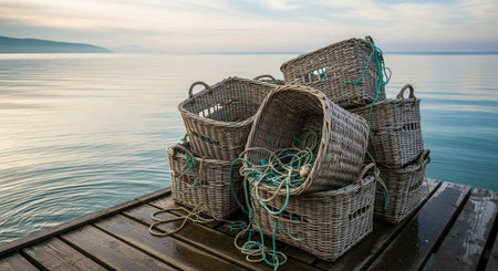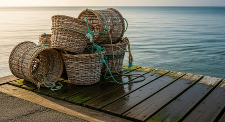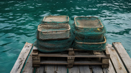 This image showcases stacked crab traps resting on a wooden dock, surrounded by calm turquoise water, reflecting a serene coastal environment ideal for fishing enthusiasts.