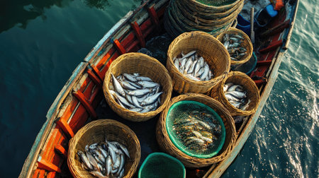 A scenic view of freshly caught fish arranged in woven baskets on a rustic fishing boat. The calm water reflects the sunrise, enhancing the peaceful atmosphere of a fishing locale.