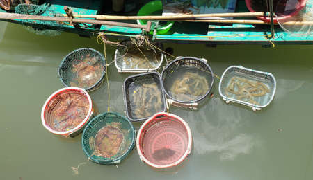 Fisherman selling fish at the floating market in Mekong Delta, Vietnam.