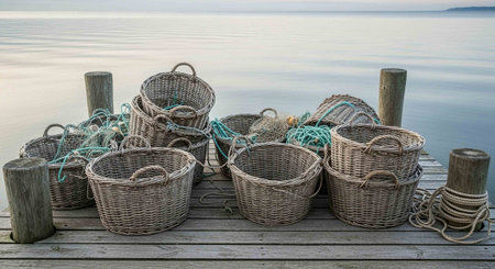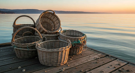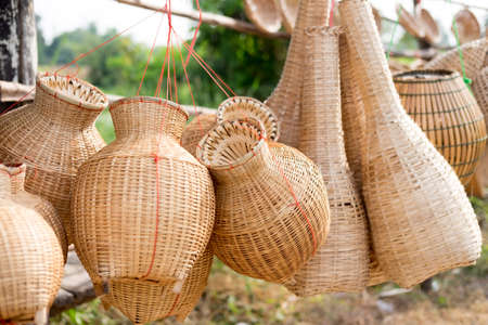 crafted woven baskets in rural village pier summer nature south eastern asian region close up outdoor view near waters