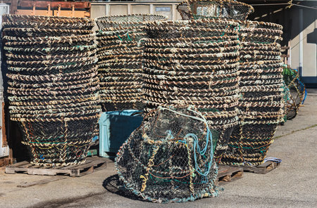Crab traps stacked on a Harbor. Pile of lobster pots, sea side fishing concept. Traditional Creels or Lobster traps or Crab Pots or baskets on the pier in the harbor.