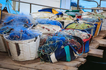 A fishing harbor scene featuring polyethylene rope rolls, nets, and buoys piled together.