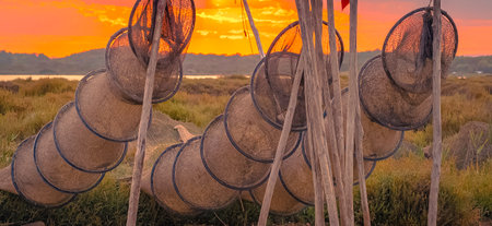 pile of empty, cylindrical wire crab traps on sandy surface, near coastal area, fishing equipment used for crabbing, shrimp