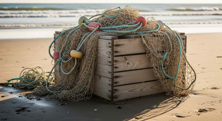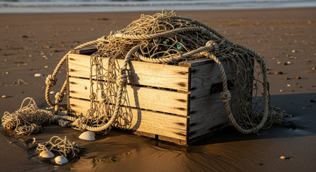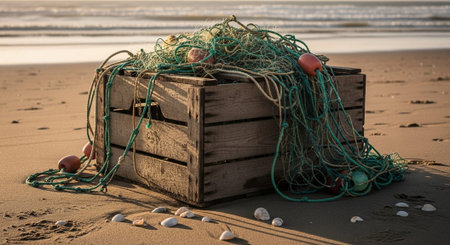 A tranquil beach scene featuring a worn fishing net draped over a wooden pier, capturing the warm glow of a sunset over gentle ocean waves.