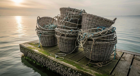 Closeup of black plastic and mesh fishing traps ropes and gear stacked on a dock near the sea