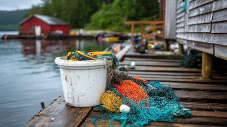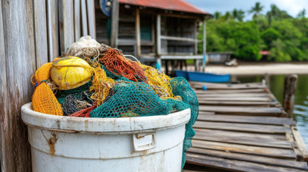 Discarded fishing gear spilling from a white bin near a weathered dockside hut