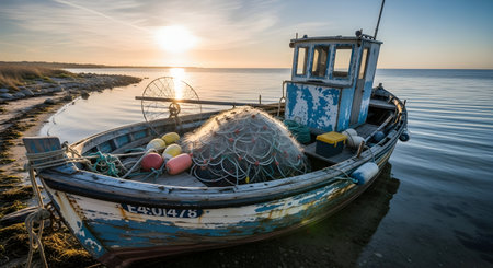The golden hues of dawn cast over a fishing boat and its sprawling nets, weaving a tapestry of industry and nature at sea