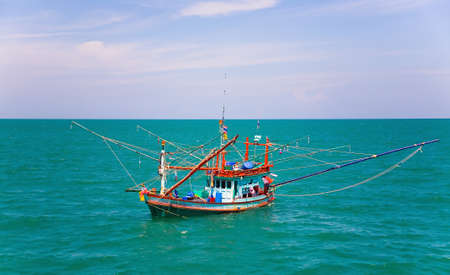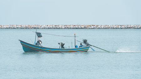 Phetchaburi,Thailand - Mar 15, 2020 : The fisherman and wooden fishing boat used as a vehicle for finding fish in the sea. Selective focus.