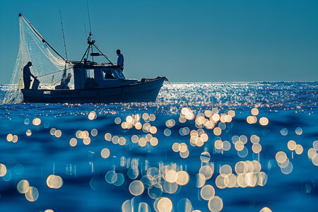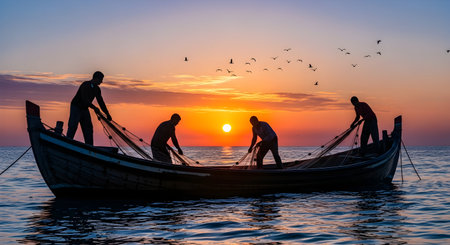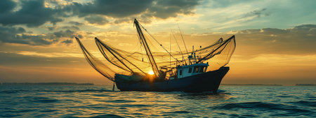 Fishing boat casting nets during sunset on the open sea, showcasing the daily life of fishermen in tranquil waters