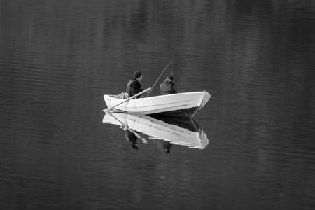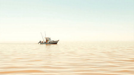 Evoke a sense of tranquility with this peaceful fishing boat sailing on calm waters. Perfect for travel, nautical themes, and serene outdoor adventures.