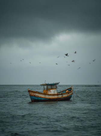 A small fishing boat floats on calm water under a cloudy, overcast sky. The boat, with a weathered appearance, showcases shades of yellow, brown, and blue. Several birds are seen flying above the boat, adding movement to the tranquil scene, suggesting potential use in editorial or commercial content.