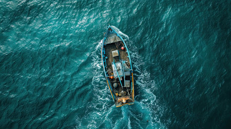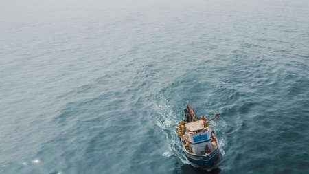 Fishing vessel boat floating in the blue sea, aerial view from drone.