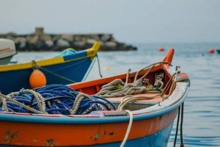 This image showcases vibrant and weathered fishing boats docked at a harbor, highlighting intricate textures and colors that evoke a sense of rustic charm and maritime culture.