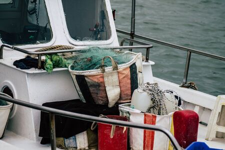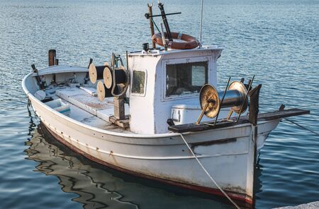 Unused small fishing boat in port with worn hull. Old fishing boat waiting for any job empty deck