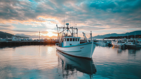 Fishing Boat Docked at Harbor During Sunrise in Tranquil Coastal Setting