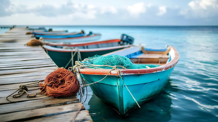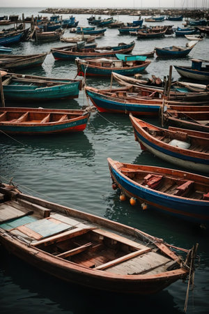 This image showcases vibrant and weathered fishing boats docked at a harbor, highlighting intricate textures and colors that evoke a sense of rustic charm and maritime culture.