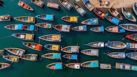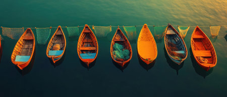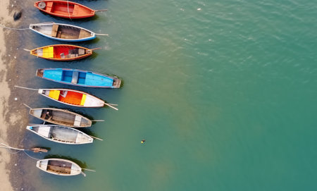 Aerial view of colorful wooden boats lined up on serene water, showcasing a vibrant palette and peaceful atmosphere.