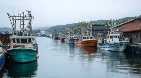 A fleet of fishing boats is docked at a harbor on a cloudy day, showcasing a scene of maritime activity and life by the sea. The image highlights tradition and industry.