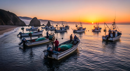 A picturesque harbor filled with small fishing boats bobbing on the calm water at sunrise. Fishermen are seen preparing their nets and gear on the decks in the soft, golden morning light.