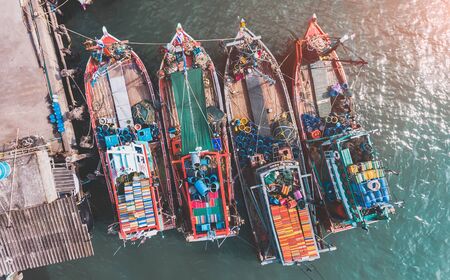 Aerial view of fisherman dock which has many ships anchoring for transport seafood and supplies on island of Songkhla, Thailand