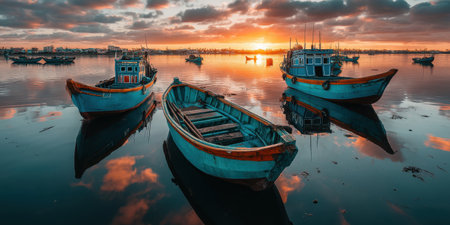 A serene scene showcasing fishing boats at sunset, mirrored on calm water. The warm hues of the sky create a peaceful atmosphere perfect for relaxation.
