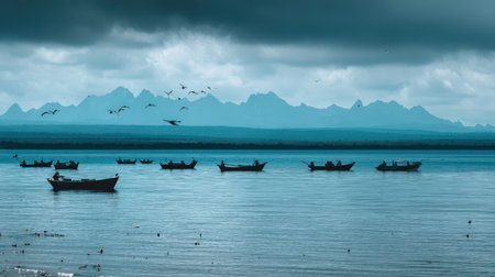 Wide panoramic view featuring multiple small, dark fishing boats resting or moving across a vast body of blue water. In the background, layers of distant, jagged mountains fade into a misty, blue haze under a heavy, dark, overcast sky, while several birds fly above the water toward the mountains.