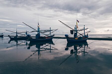 Coastal fishing boats at low tide in summer of Thailand