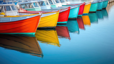 Row of colorful fishing boats lined up in a calm marina reflecting on the water's surface