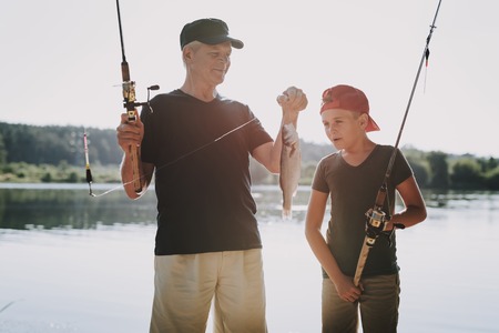 Happy Grandfather and Grandson Fishing on River in Summer. Relaxing Outdoor. Old Man and Boy. Men near Lake. Fishing Rod in Hands. Sports in Summer. Weekend on River. Aged Fisherman.